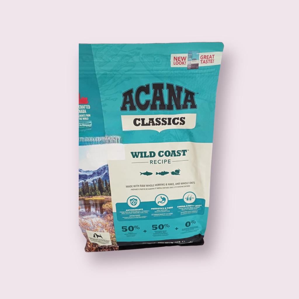 Acana Wild Coast es un alimento para perros. Contiene un 50% de pescado, hasta el doble de la mayoría de los alimentos para perros. Sus ingredientes son de calidad de grado humano, es decir, aptas para el consumo humano. En su preparación, 1/3 es carne fresca que aporta nutrientes esenciales en su forma más nutritiva. El otro 2/3 consiste en carne seca para aportar una fuente sólida y natural de proteínas nutritivas.